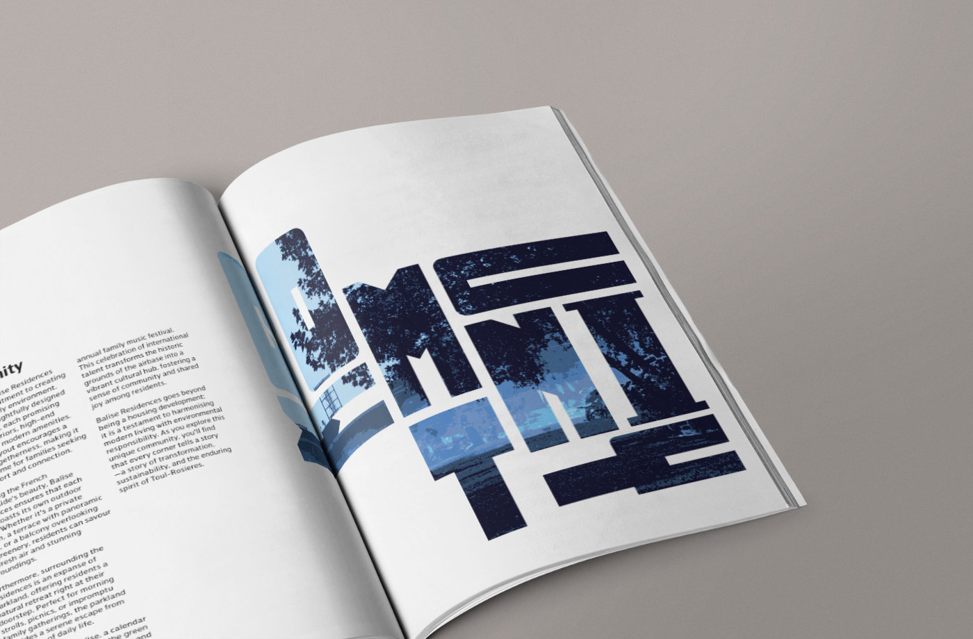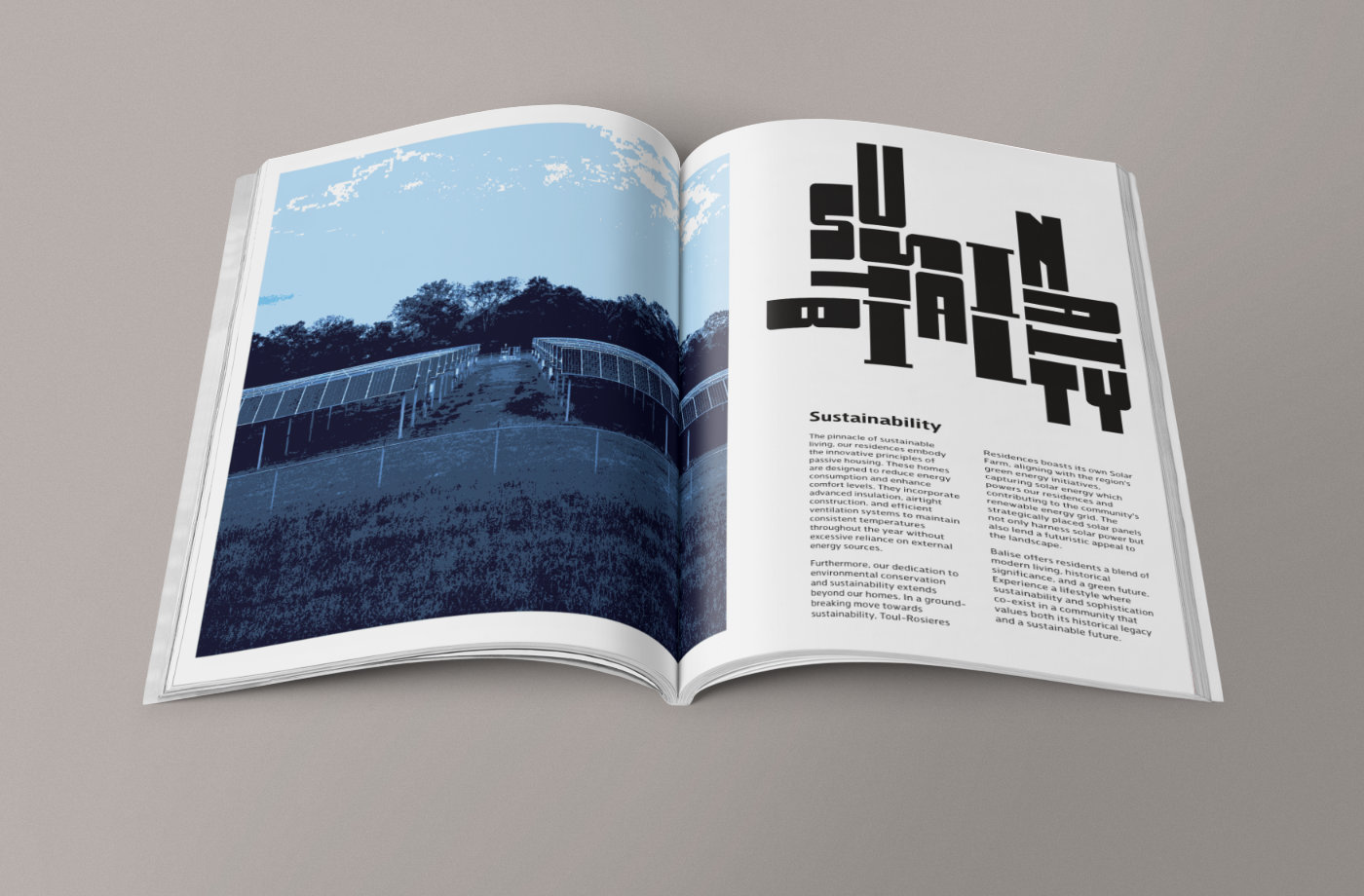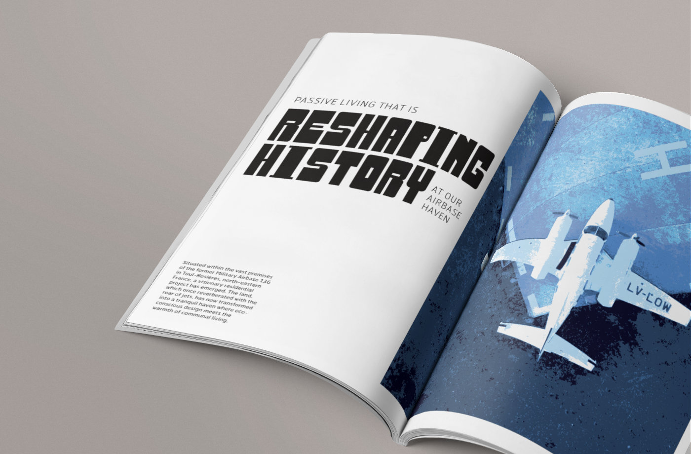 Balise is an (imagined) real estate development built on the site of a former airbase. It uses passive housing techniques to minimize its environmental impact. I created a short editorial to promote the unique property development, and appeal to an audience with modern design sensibilities. I custom designed the lettering to give it an offbeat, forward thinking aesthetic.