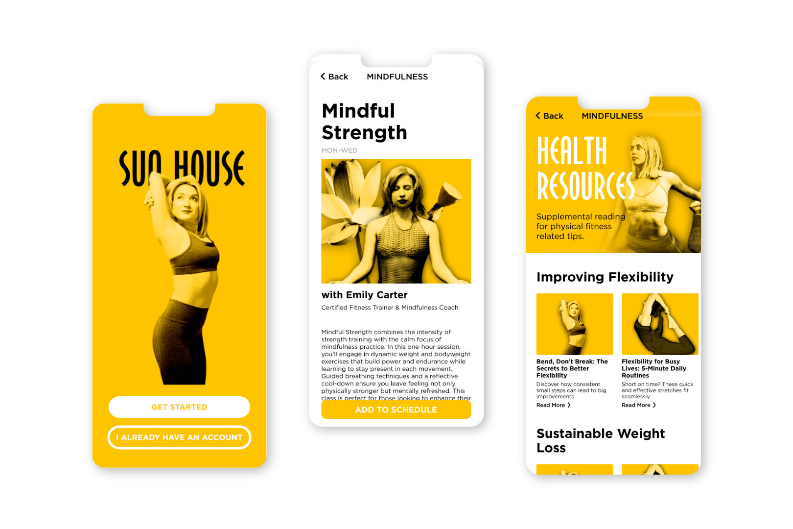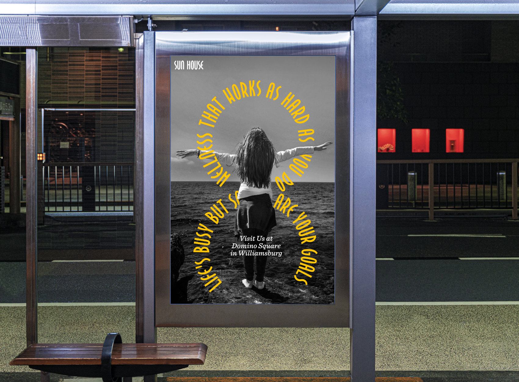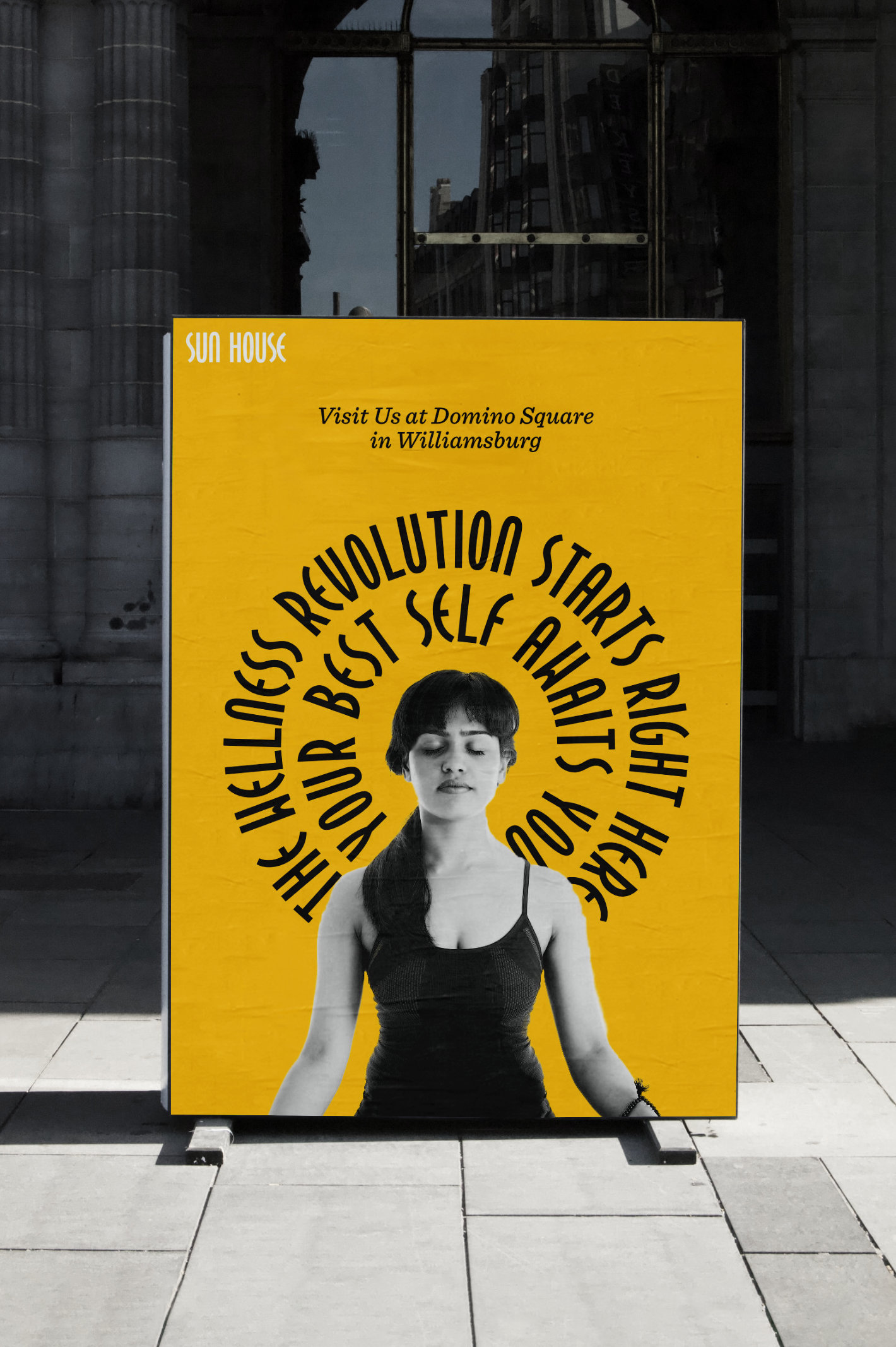 Sun House is an imagined high end fitness center that emphasizes both physical and mental wellness. In addition to luxurious facilities for exercise, Sun House offers classes and experiences tailored to holistically nurture both body and mind, like meditation spaces and group therapy classes. Reflecting its purpose, I designed a custom typeface with gentle curves that expresses the gentle calm and pleasure one finds in mindfulness. The motif of text arranged circularly resembles sunbeams. The visual identity captures Sun House’s image as a place where one finds both their inner and outer glow.